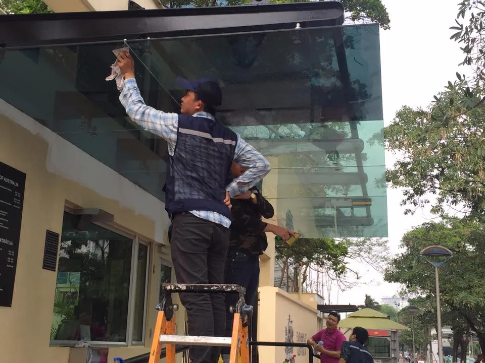 Thi công phim cách nhiệt chống nắng nóng cho mái kính và dán kính cách nhiệt văn phòng Đại sứ quán Australia. – Màu xanh ngọc, ánh đen ngăn nhiệt và loại bỏ 99% tia UV – Tiết kiệm 35% lượng điện sử dụng cho điều hòa làm mát hoặc sưởi ấm
